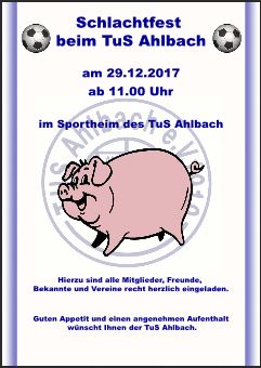 Am Samstag, den 26.01.2019 findet ab 11.00 Uhr das Schlachtfest im Sportheim Ahlbach statt!
